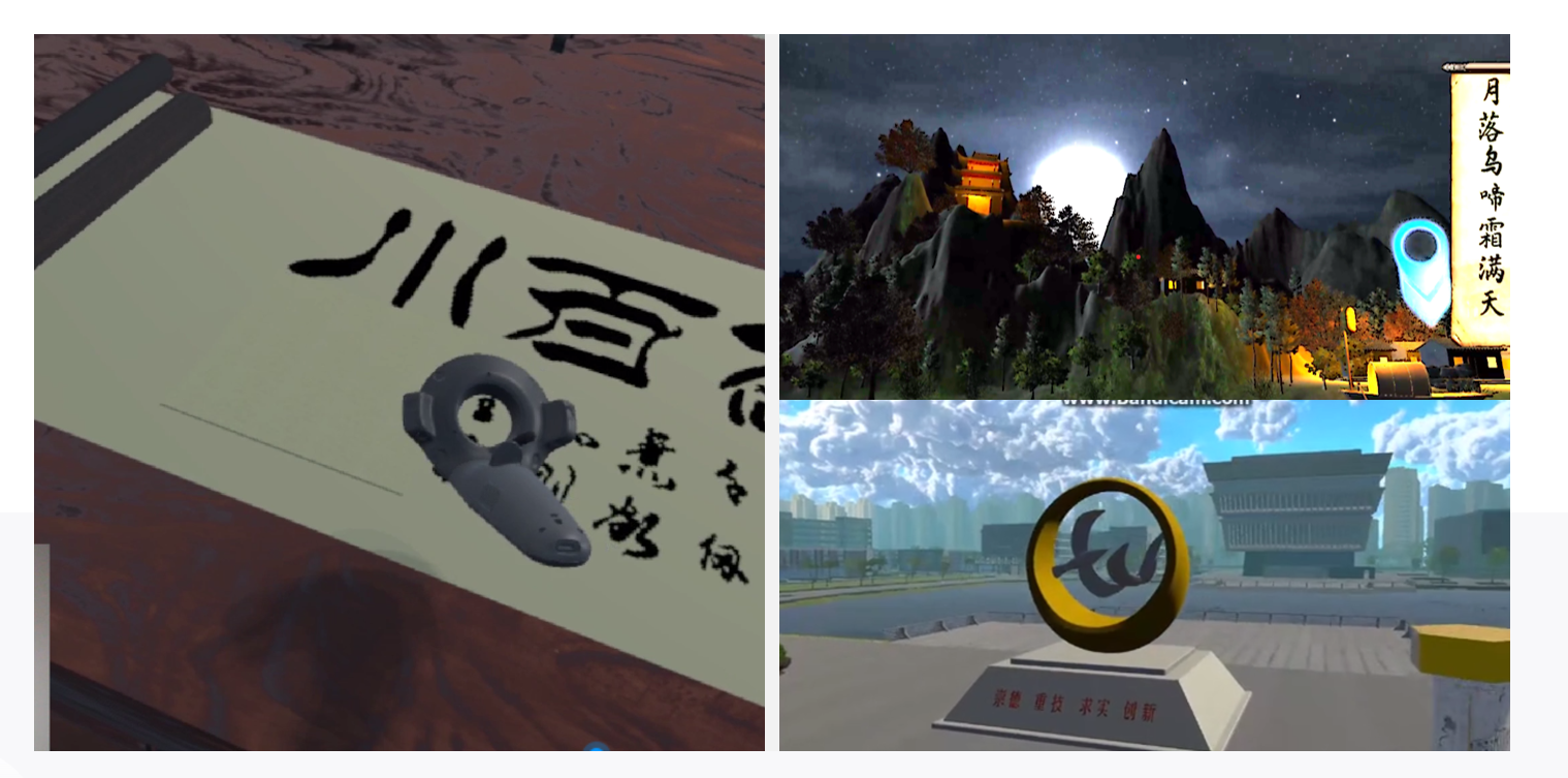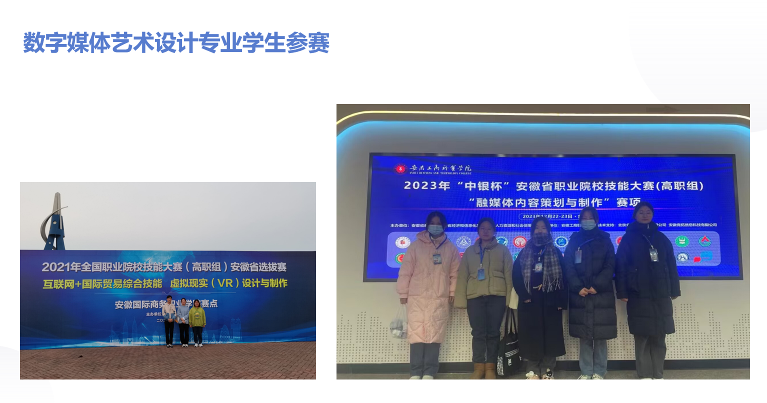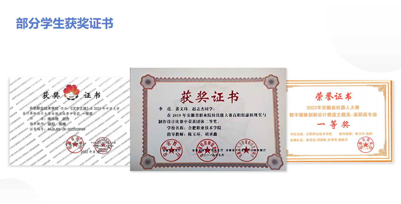 【专业建设成果】2017年我院成为虚拟现实教育联盟第一批联盟单位,与多个虚拟现实公司、动画公司有着合作。数字创意产业为省十大产业,紧紧围绕地方经济社会发展办专业,课程进行岗课赛证融通,在学生自主意愿的情况下可以进行考取相关证书。在职业技能大赛比赛方面:2016年安徽省职业院校VR虚拟现实职业技能大赛获安徽省一等奖1项、三等奖1项;2017年安徽省职业院校VR虚拟现实职业技能大赛获三等奖;2018年安徽省职业院校VR虚拟现实职业技能大赛获二等奖;2021年全国职业院校技能大赛安徽省选拔赛第四,2022年安徽省HTML5交互融媒体内容设计与制作赛项三等奖,2023年安徽省融媒体内容策划与制作一等奖、三等奖,安徽省数字化产品设计与开发二等奖、三等奖。2024年安徽省融媒体内容策划与制作二等奖、三等奖,安徽省数字化产品设计与开发三等奖。B类专业技能赛事方面从2018年至今获得百余项。在课程建设方面:《设计基础》课程为省级MOOC,《unity基础》、《VR项目实操》为省级资源库课程,《虚拟现实背景下徽文化的创新设计与传承》、《设计基础课程中徽元素的艺术表达》、《非遗文化网页设计》为国家级资源库课程。