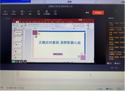 此次讲座主要有四部分内容:一是正确认识“新冠”,让学生了解目前新冠病毒的情况,作为当代大学生,要学会从正确渠道或者官方媒体了解“新冠”知识,做到不恐慌、不信谣、不传谣。二是接纳处境。客观看待“幻阳”、“阳了”和“阳康”,面对不同的处境,要平和心态,调整情绪,科学防疫。三是规律作息。保证每日规律作息,一日三餐,多喝水、多吃水果蔬菜、适当活动。网课之余,充实生活,帮助家人做做家务、多与家人沟通交流。四是自我心理调适。面对负性情绪和不良认知。要正视,学生整合内外部资源,构建社会支持系统,必要时求助心理老师甚至专业医生。最后还指导学生们自学“心理着陆技术”,学习如何疏导自己的负性情绪,在日常生活中有意识练习“心理着陆技术”,帮助学生们平稳情绪。