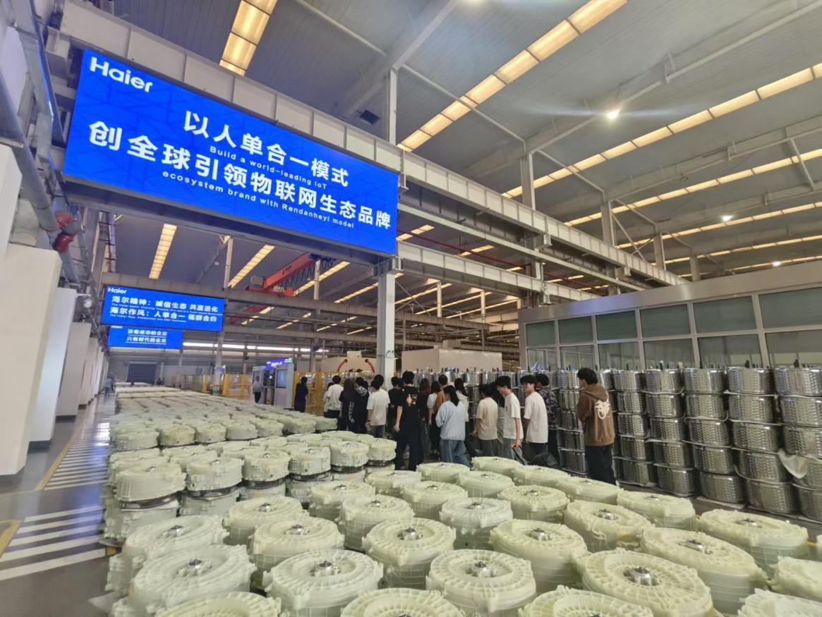在参观智能化生产线时,同学们近距离参观了工业互联网技术在家电制造中的应用。海尔“人单合一”的管理模式给同学们留下深刻印象——这一模式强调员工与用户需求直接对接,鼓励创新和自主经营,体现了海尔“人人都是CEO”的扁平化管理理念。通过企业宣讲,同学们进一步了解到,海尔的文化核心是“创业创新”,其发展历程从传统制造企业转型为物联网生态平台,正是基于对用户需求的敏锐洞察和持续的技术突破。