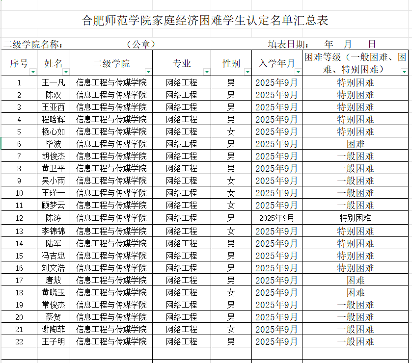 根据《合肥师范学院家庭经济困难学生认定工作实施办法》和《关于认真做好合肥师范学院2025-2026学年家庭经济困难学生认定工作的通知》,遵循公平、公正、公开的原则,在各位同学申请的基础上,经过班级评审小组测评,共有以下同学认定为贫困生。