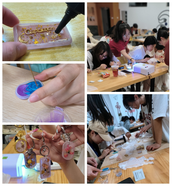 活动中,通过播放视频向同学们详细地介绍了滴胶活动需要的相关材料和滴胶制作原理以及相关注意事项。同学们对于水晶滴胶也是第一次接触,对于制作也是充满了热情与好奇,在拿到材料后,挑选自己喜欢的模具,纷纷开始进行胶水的调配。活动志愿者们也细心地提醒大家各个步骤需要的胶水比例以及注意事项,活动现场气氛热烈。一片片叶子,一朵朵鲜花,一个个小饰品在滴胶中伸展,凝固,同学们用双手将美丽定格,留住最美的瞬间。