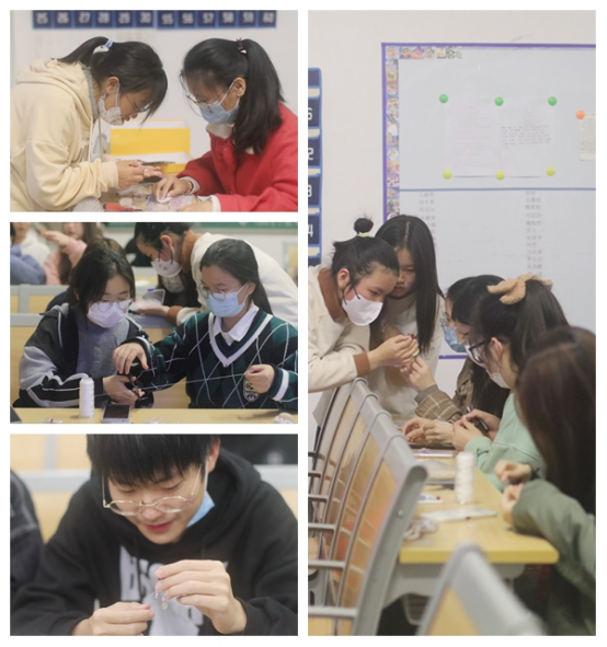 在制作过程中,志愿者在一旁细心指导,并告诉同学们一些关于耳珰的历史。同学们迫不及待将已完成的耳饰带上,相互欣赏。看着自己亲手做成的耳珰,装饰着自己的容颜,脸上不禁露出了满意的笑容。同学们纷纷表示,以前都是在商店购买耳饰,现在可以按照自己的创意来做,激发了动手欲和创作欲,还充实了课余生活。