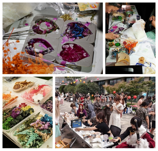 香薰蜡片手工制作的现场,参与者们小心翼翼地将熔化的蜡倒入模具,并快速点缀数朵自己心仪的干花装饰,待蜡油凝固后,一枚枚造型独特、芬芳浓郁香薰蜡烛就制作完成了。