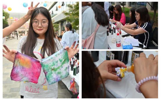 “青取之于蓝,而青于蓝。”散落在诗词里的自然“蓝”,落在布料上变成了颜色“蓝”,也就诞生了中华独特的染色工艺——扎染。活动中,志愿者们为同学们提供了扎染所需的材料。在志愿者的指导下,大家充分发挥想象力,将布料进行缠绕、蜷曲、折叠、固定,小心翼翼地将扎好的布料放入染料中,等待着神奇的变化。布料展开的那一刻,大家都被眼前绚丽多彩、独一无二的图案所惊艳。