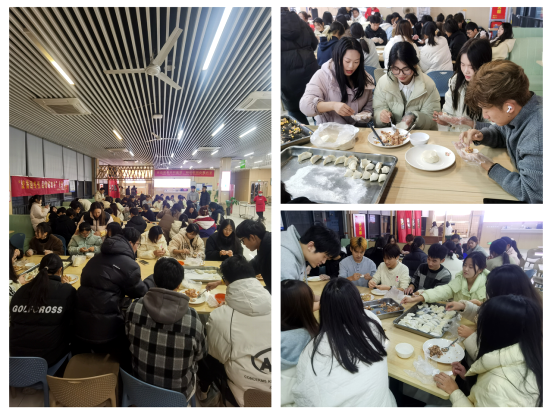 在二楼餐厅,师生们有条不紊地备馅、配料、包饺子。在说说笑笑中,大家的面前就排满了一个个形状各异,大小不一的饺子,有月牙状的、元宝形的、蛤蜊状、爱心形的.....还有的同学别出心裁,包出美穗形的、蝴蝶形的、玫瑰花形的,不一而足,美不胜收。当然,也有一些来自南方的同学初次包饺子,显得“笨拙”一些,要么是“大腹便便”,要么“龇牙咧嘴”,引得周围的同学们哄堂大笑。