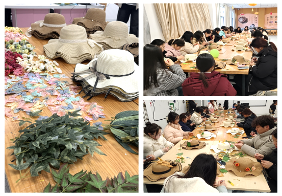 活动现场,师生们化身“设计师”,通过缠绕丝带、粘贴干花、手绘图案等方式,将一顶顶素色草帽装点成独一无二的艺术品。大家一边创作,一边分享生活点滴,交流粘花心得,温馨的氛围在空气中弥漫开来。