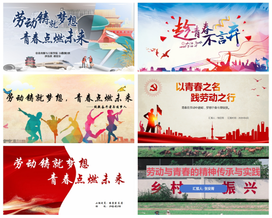 学院同时举办“劳动铸就梦想、青春点燃未来”主题PPT设计比赛,通过线上投稿形式鼓励学生以数字化设计展现对劳动精神与五四精神的理解。截止5月5日,共收到60多份作品。参赛作品将传统节日元素与现代设计理念结合,既有对历史的致敬,又有对新时代的展望,充分体现青年一代对历史传承与时代使命的思考。