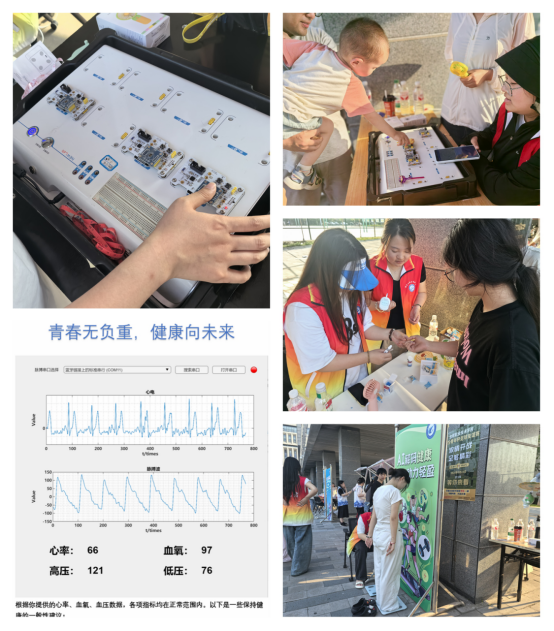 智能先锋社团主导的“AI解码健康”专区成为活动焦点。师生们通过社团自主研发的PTT无创电子血压计、多功能体脂秤等设备,快速获取心率、血氧、血压、体脂率、血糖等7项身体指标,AI算法即时生成个性化电子健康报告。报告不仅标注风险项,还提供饮食、运动等定制建议。“我的体脂率偏高,但基础代谢达标,AI建议我加强力量训练而非单纯节食。”物联网专业学生陈一畅表示。