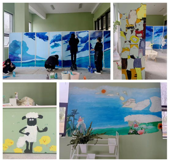 此次手绘活动形式多样,学生们根据自身情况来选择手绘屏风、墙绘或纸绘。活动前期,指导老师带领同学们对手绘的图案进行总体设计和具体分工。参与墙绘和手绘屏风的同学们站在墙前一笔一画,互帮互助,从构图、打形到调色、涂色,顺利有序地进行着,原本灰白的墙体上呈现出一幅幅美丽的画卷。纸绘的同学们也毫不逊色,尽情释放自己天马行空的创意,挑战各种独特的色彩搭配。