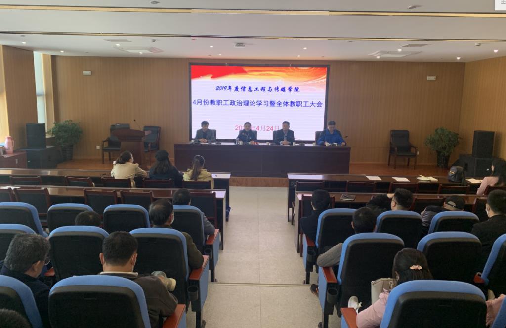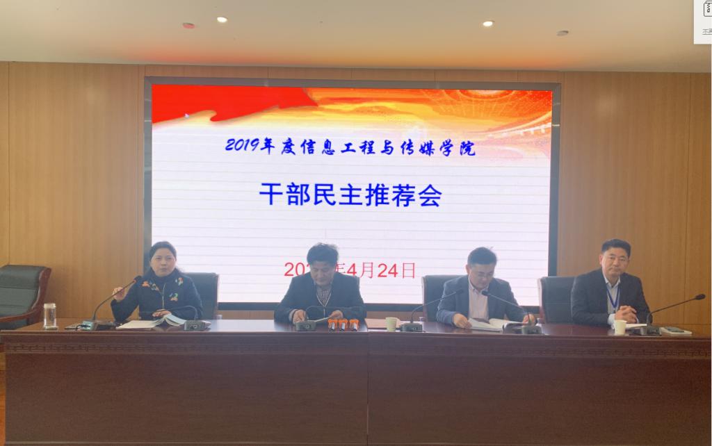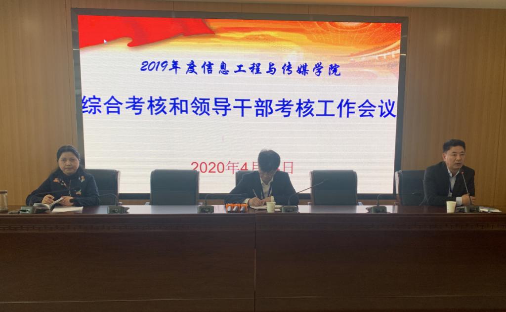 根据《合肥职业技术学院 2019 年度二级学院 (部门)综合考核和领导干部考核实施方案》和干部推荐相关工作的统一部署,4月24日,信息工程传媒学院在图书馆报告厅召开2019年度综合考核会议暨2020年全体教职工大会,会议由学院党总支书记李红雨主持,党委综合考核组第六组组长朱道林一行出席会议,学院全体教职工参加会议。