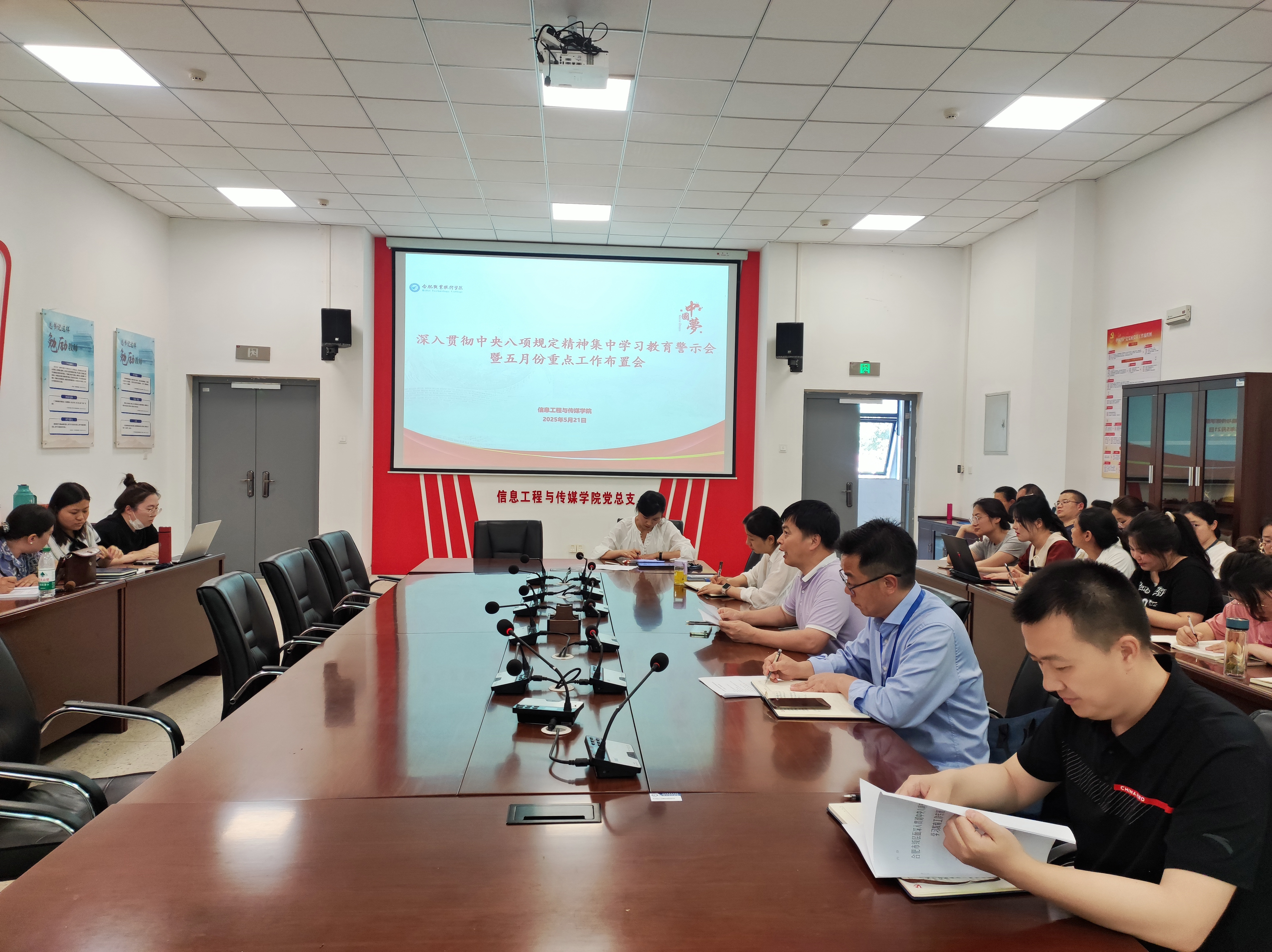 为进一步推进深入贯彻中央八项规定精神学习教育,加强作风建设,夯实责任担当,5月22日,国产又色又粗又黄又爽在信息楼会议室召开深入贯彻中央八项规定精神学习教育警示教育会暨5月份重点工作布置会议,会议由学院党总支副书记(主持工作)尹仕果主持,全体教职工参加会议。