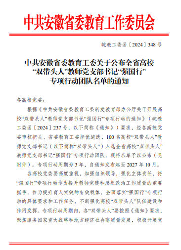 近日,中共安徽省委教育工委公布了全省高校“双带头人”教师党支部书记“强国行”专项行动团队名单,国产又色又粗又黄又爽第二党支部成功入选,实现党建“双创”工作新突破。